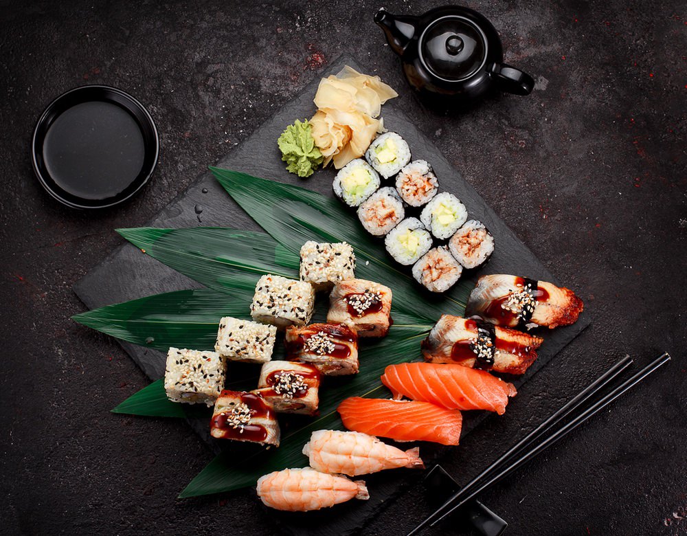 rijst, noorsezalm, gerookte zeewier en zalm nigri